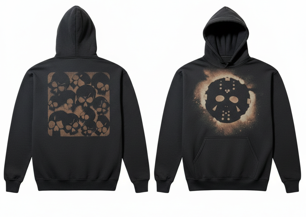 This one-of-one Bleach Bum hoodie brings horror-core heat with a bleach-blasted hockey mask up front and a skullstorm on the back. Hand-treated for that raw, rust-toned fade, each hoodie is uniquely distressed and never duplicated.
