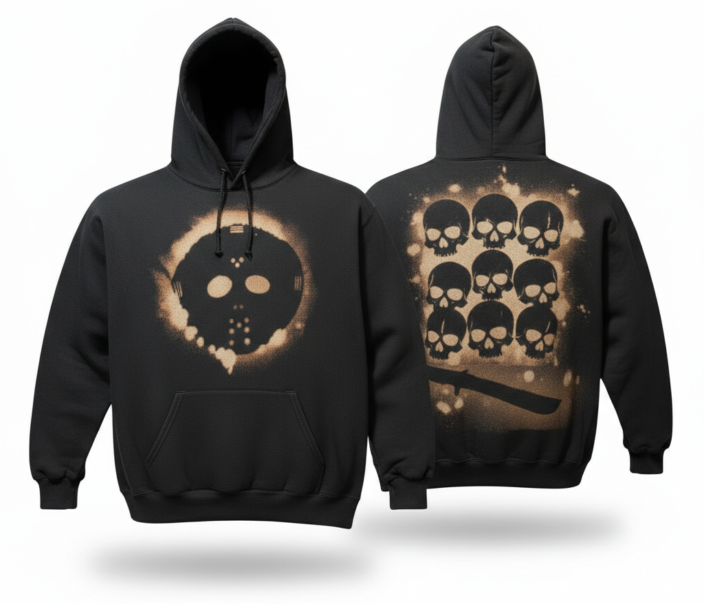 Warning: May cause double takes. This one-of-one Bleach Bum hoodie is a full-on fright fest—in the best way. Up front, a bleach-faded hockey mask stares down the ordinary. On the back? A skull swarm and a machete silhouette that scream “final boss energy.”